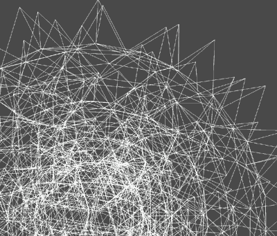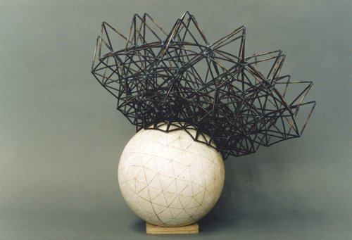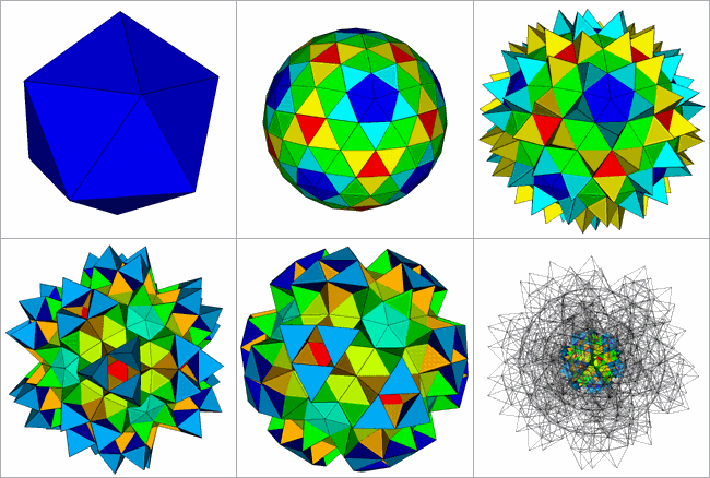 The icosahedral seed can be viewed to have triangular arrangements of geodesic spars, 30 in all. To set this cosmic net off on its travels ... the triangular arrangements have points projected away from their spherical level and into the space directly above themselves, creating the apexes of tetrahedra; 3-D's version of an equilateral triangle. Theoretically, by repeating this sequence level upon level, the mesh of an infinite net is cast far and wide, outwardly onwards towards infinity.