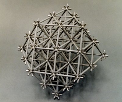 CODE CONNECTION A poetic aspiration to explore the idea of emanation led me to investigate various space filling networks, one of which was coined the "Vector Equilibrium" by the late American Inventor/Geometer, Buckminster Fuller. (See also Code Connection poster.) Below you can see a linear network representing the vectors from centre to centre of neighbouring equal sized spheres, in the "cubic close packed" matrix.