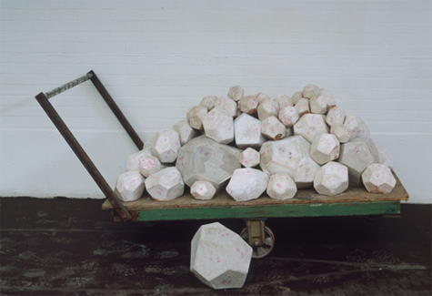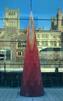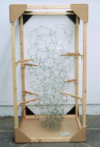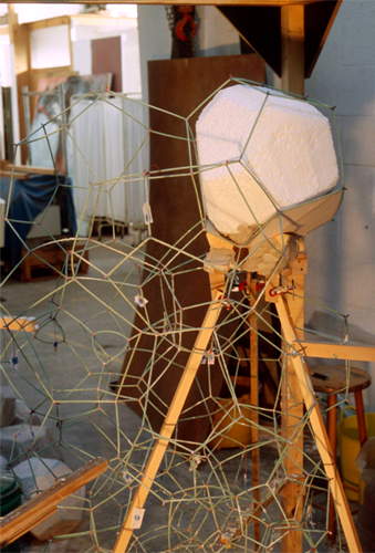 When modelling in this way and as a foam bank is evolving, decisions on comparative rod lengths become more critical and choices are taken to eradicate any compound curvature in the rods, which seem to seldom occur in real foam. It is an intuitive process where the "trial and error" approach eventually pays off. The high degree of freedom in this modelling technique apparently corresponds to the character of cell edges and corners in real foam, where countless combinations of cell shapes and cell sizes will meet. Worth bearing in mind here is that as with real foam, the "cells" on the periphery of the colony are different from those within the bulk of the complex. In the modelling system, cell edges surrounded by neighbours have full influence from the three "rings of edges" which they are part of (rings of face edges in real foam) whereas those cell edges not totally enclosed have rods of a more "relaxed" nature. Also of note is that where soap cells meet the internal surface of a containing vessel, cell edges linking that 2-D "vessel surface design" to the foam within, inwardly project at tangents of approximately ninety degrees. This is where the transition of spatial rules between three and two dimensions is taking place. My modelling process is always accompanied by a large glass vessel filled with soap foam, so that I may compare as I progress. Summary of findings Foam expresses the dynamic equilibrium formed when the forces of pressurised air pockets co-exist with the surface tension of water, forcing an accommodation of each other's energy. So, in simple terms we see a dual system of air pressure versus water tension, although in reality they are inextricably involved in each other's status; and other lesser forces are involved. Understanding the transition from a wet foam to a dry foam, is essential for a clear view of the geometric characteristics of a closed cell dry foam. Imagine the moment when a wet foam is being formed, many spheres of air are surrounded by adequate water so that no contact is made with neighbouring air bubbles. As gravity drains the excess water from around the bubbles they will soon come to make contact. The first thing to happen is that they will kiss, that is to say that they touch at a point. These points rapidly open out laterally on the surfaces of neighbouring bubbles, forming a disk of contact. The disks enlarge until other disks similarly generated around the bubbles meet. This is the moment that edges and ultimately corners are created, changing the bubbles into polyhedral cells. Surface tension is the cause of this constriction, and the process ceases when the pressure within the air pockets is strong enough to resist further progress. What were once independent bubbles are now a colony of interdependent cells. The characteristics of corners, edges, and films, are arranged by default in accordance with underlying geometrical efficiencies necessary to sustain a structural integrity. The most interesting aspects of this geometric default is the consistency of Maraldi angles (approximately 109 degrees) at the corners of cells, and the 120 degree angles emanating between film faces "spline-like" along the curved edges. These particular angles are present owing to their fundamental nature. The Maraldi, or tetrahedral angle, is the first symmetrical division of 3-space when emanating from a point. It has four directions equally spaced, the least possible. The three directional symmetry associated with film co-angles, is a consequence of this corner angle, the cell walls could not be arranged in any other way. These constant corner angles, where four edges and six films meet within a random colonisation of various sized air pockets, cannot join up in straight lines (edges). Curvature along the edges in between these corners is how this problem is overcome, and similar forces replicate these curves in the modelling system. By subtracting the cell faces from the equation, leaving only corners and edges, the difficulty of linking these angles is taken up by flexibility in the rods. Whilst understanding that the films (faces) are remnants of original independent bubble surfaces, in the context of a cell complex I prefer to see films as simply spanning "rings" of edges. These films are minimal surfaces, indicators of pressure differences yes, but also subject to the powers of geometric default in the corners and edges of that network. The Artwork Foam structure is an eminent expression of energy conservation, and in my opinion beautiful because of this. This mysterious structure where these qualities of efficiency and beauty are interwoven is a real wonder, and fruitful meditation on this subject will draw the viewer in contact with elemental geometric rules, and their physical consequences. Now, for me the science of the subject is only half of the story, I also have to evolve an artwork, which above all has presence and meaning. The reader may appreciate that building a durable structure which is closely related to soap foam is not going to be an easy ride. It seems likely to be fraught with endless technical problems, inhibiting geometric parameters, and visual flaws; and so it is! I have worked through quite a few ideas concerning the look and build-technique of such a sculpture, and within the particular circumstances of my current commission I have decided to more or less stick with uncomplicated look of the modelling system, a design I feel is both technically plausible, and visually arresting. One thing I have done in order to fortify the visual impact of the piece is to exponentially increase the cell sizes in the vertical direction, adding a sense of the foam "billowing forth".