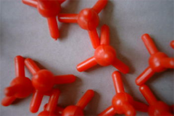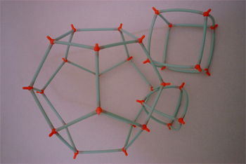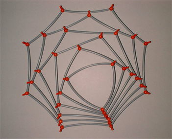 Now, you may ask, what is the role of an Artist in all of this? Well, I am in the process of creating an artwork which aspires to reflect the geometric conditions of this water matrix, and aims to celebrate the mesmeric relationship between beauty and natural efficiencies. In re-presenting experience the Artist, to a greater or lesser degree edits, orders, and interprets perceptions, entertaining certain compromises such as the use of a particular medium, or "freezing" a dynamic system. These compromises are an intrinsic part of the creative process, setting parameters, and where appropriate should be seen as opportunities. I also have to consider the various modelling techniques available to me, always with an eye on the practicality of any given process, its durability, and how they might impact on the overall "feel" I am aiming at. Experimentation To enable the creation of a credible Artwork concerning the structure of foam, the Artist should, at least, have a partial understanding of the subject. As mentioned earlier, I have sought to build my knowledge through observation, reading, and experimentation. The most fruitful experiments I've conducted to date have been achieved with the help of a particular molecular modelling node. As I came to understand the structure of foam a little more, I realised that this node along with the use of flexible joining rods of differing lengths, could enable a very handy modelling technique, one I have subsequently found to behave in a very similar way to the edges of real foam. In my past experience of working alongside Mathematicians, one trick learned in understanding difficult spatial problems is to whenever possible reduce the issues involved by spatial dimensions. So, for instance, when investigating the properties of a sphere, where possible simplify things by applying the question to a circle. When appropriate this approach can enable an understanding where previous attempts proved overly complex. The benefits of dimensional "downsizing" (by which I reduce the foam to only edges and corners), allied with the development of a simple modelling technique where I have utilised a particular molecular node, has been invaluable. The node I am referring to is that associated with the fourfold carbon bonds found in diamond, the one where the four equally spaced valency pegs would fit into the four corners of a regular tetrahedron. The angle between pegs is approximately 109 degrees and is known as the "Maraldi". This is the same symmetry we find at the very heart of the four edged corners of foam.